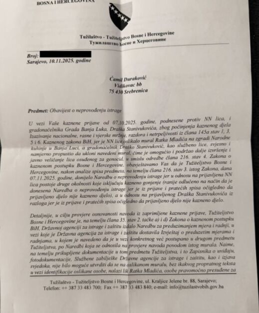 Tužilaštvo Bosne i Hercegovine donijelo je odluku o neprovođenju istrage po krivičnoj prijavi koju je 7. oktobra 2025. godine podnio Ćamil Duraković, potpredsjednik manjeg bosanskohercegovačkog entiteta RS protiv nepoznate osobe koja je oslikala mural osuđenog ratnog zločinca Ratka Mladića na zgradi Narodne kuhinje u Banja Luci, te protiv gradonačelnika Draška Stanivukovića koji je odbio ukloniti sporni mural.