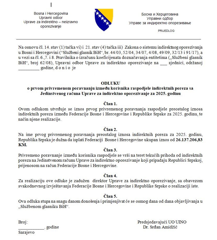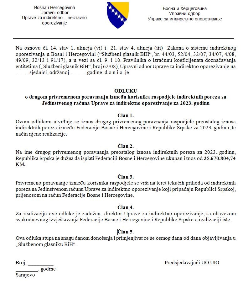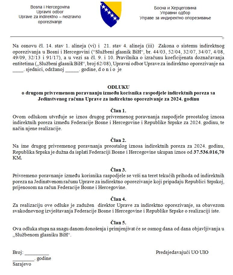 Uvidom u odluke koje je UIO dostavio Upravnom odboru UIO, Republika Srpska za 2023. duguje Federaciju BiH 35.670.804 KM, za 2024. godinu 37.536.016 KM, a na ime prvog privremenog poravnanja u 2025. godini dug iznosi 26.137.206.
