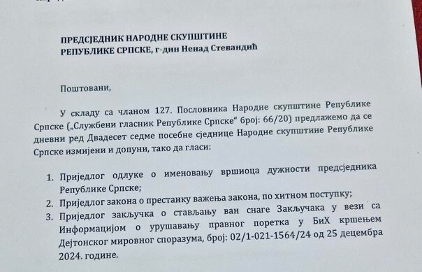 – Narodna skupština Republike Srpske konstatuje da neustavni Tužilaštvo BiH i Sud BiH vode politički montiran proces protiv predstavnika Republike Srpske, a koji se zasniva na nezakonito nametnutim odlukama Kristijana Šmita a iz razloga jer su predstavnici Republike Srpske postupali isključivo u skladu sa ustavnim i zakonskim ovlašćenima i obavezama u okviru zakonodavnog postupka čiji je nosilac Narodna skupština Republike Srpske, te u skladu sa tim zahtijeva od istih da odmah obustave ovaj politički montiran proces.