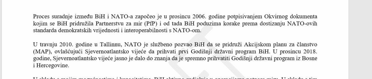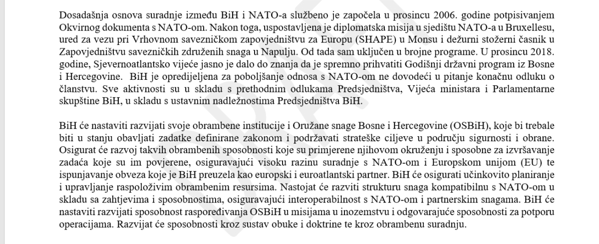“U aprilu 2010. godine u Tallinnu, NATO je službeno pozvao BiH da se pridruži Akcijskom planu za članstvo (MAP), ovlašćujući Sjevernoatlantsko vijeće da prihvati prvi Godišnji državni program BiH. U decembru 2018. godine, Sjevernoatlantsko vijeće jasno je dalo do znanja da je spremno prihvatiti Godišnji državni program iz Bosne i Hercegovine”, stoji između ostalog u Programu reformi, gdje se ‘između redova’ provlači članstvo BiH u MAP-u, što SNSD stalno negira.