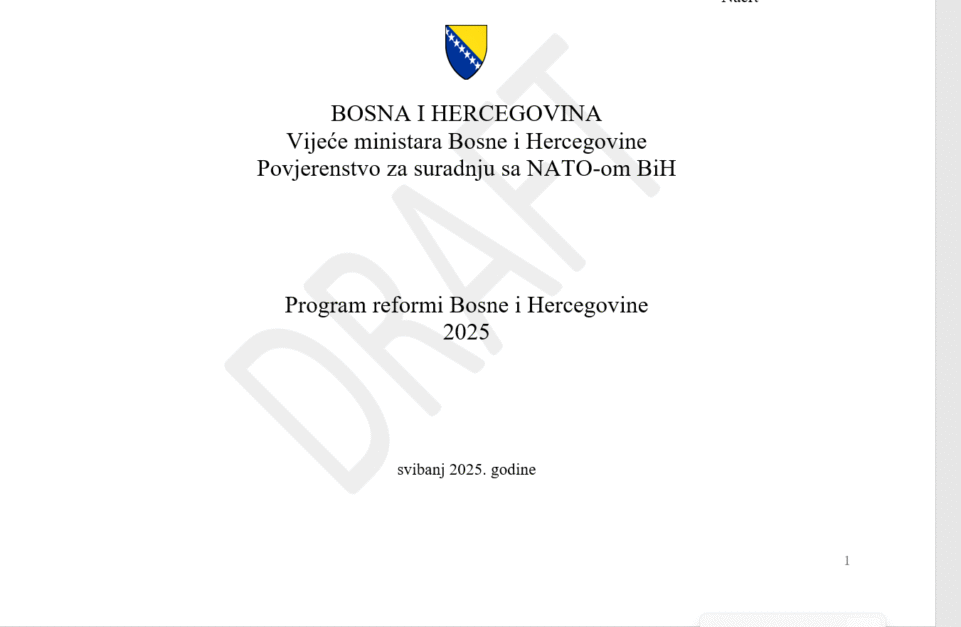 Nacrt dokumenta “Program reformi Bosne i Hercegovine 2025“, koji je pripremila Komisija za saradnju s NATO-om BiH, upućen je na javne konsultacije i uskoro bi se mogao naći pred Vijećem ministara BiH, piše Raport.