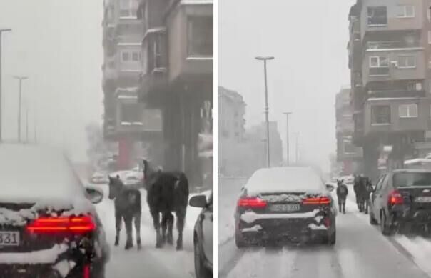 Dok se konji kreću glavnom saobraćajnicom kao da je riječ o običnoj šetnji, vozači usporavaju i pokušavaju ih zaobići, dodatno otežani snježnim uslovima na cestama.