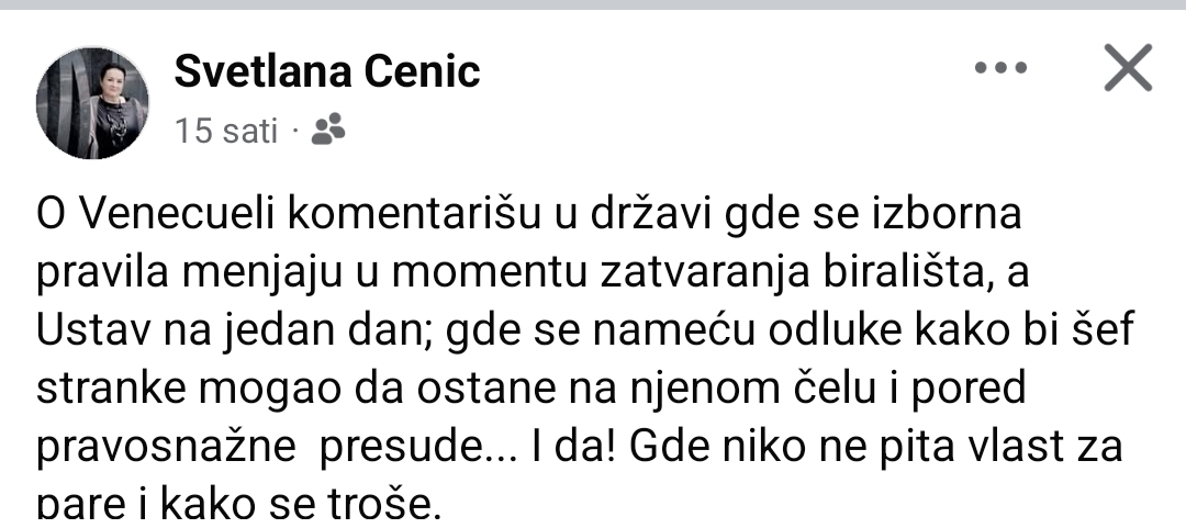 - O Venecueli komentarišu u državi gde se izborna pravila menjaju u momentu zatvaranja birališta, a Ustav na jedan dan; gde se nameću odluke kako bi šef stranke mogao da ostane na njenom čelu i pored pravosnažne presude… I da! Gde niko ne pita vlast za pare i kako se troše – napisala je Cenić.