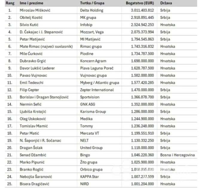 Na listi, očekivano, dominiraju srpski i hrvatski biznismeni, među kojima se po prvi put smjestio i neko iz BiH. Naime, na 21. mjestu nalazi se Senad Džambić, vlasnik Bingo grupacije, koji je prema podacima sa liste “težak” 1.046.220.360 evra.