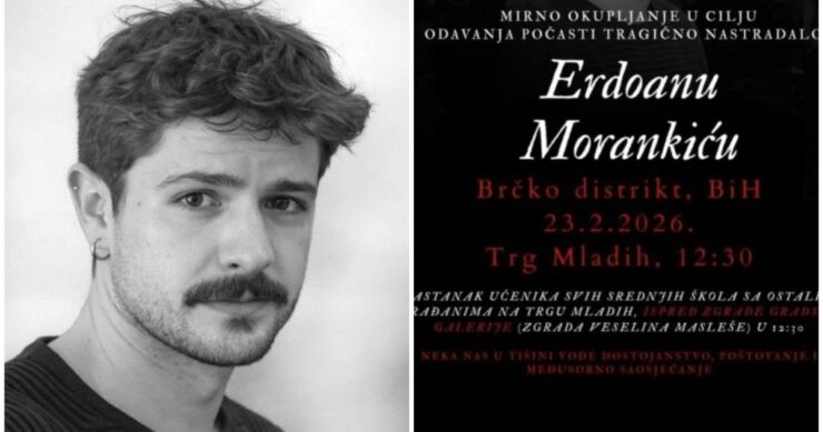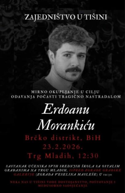 Građani Sarajeva već sedmicu izlaze na ulice, tražeći pravdu, transparentnu istragu i sistemske promjene. Protesti su prerasli u snažan građanski bunt koji okuplja sve generacije, a naročito mlade.Val podrške koji je pokrenut u Sarajevu sada stiže i u Brčko. U ovom gradu će u ponedjeljak, 23. februara 2026. godine, biti organizovano mirno okupljanje u znak sjećanja na tragično stradalog Erdoana Morankića.Skup pod nazivom “Zajedništvo u tišini” planiran je u 12:30 sati na Trgu mladih, ispred zgrade Gradske galerije, poznate kao zgrada Veselina Masleše. Organizatori su pozvali učenike svih srednjih škola, kao i ostale građane, da se pridruže i zajednički, dostojanstveno i u tišini odaju počast.