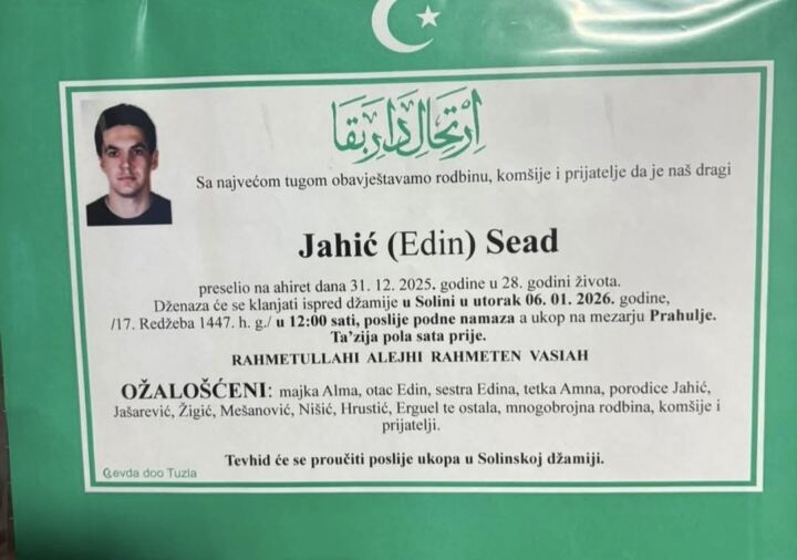 Dženaza Seadu Jahiću, mladiću iz Tuzle koji je nađen mrtav na Jahorini, bit će klanjana sutra u Solini kod Tuzle poslije podne namaza Podsjetimo, pripadnici Gorske službe spašavanja...
