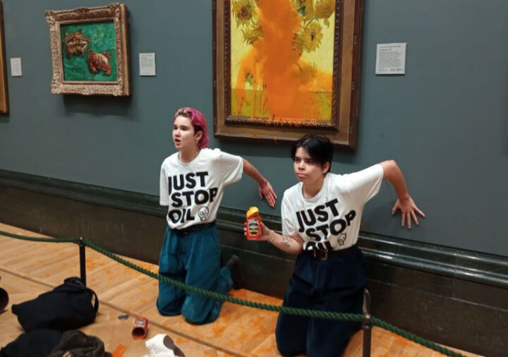 Aktivisti iz grupe "Just Stop Oil" zasuli su supom od paradajza Van Gogovo (Vincent van Gogh) remek-djelo "Suncokreti" u Nacionalnoj galeriji u Londonu Dvije žene ušle su u prostoriju u...
