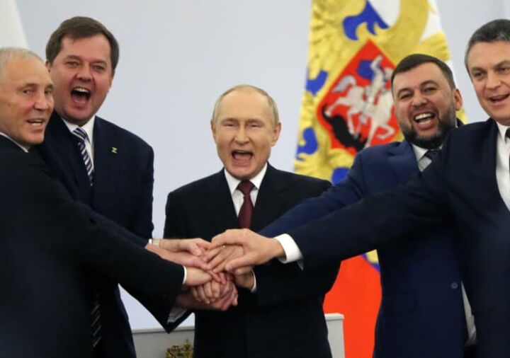 Osam i po godina nakon što je Vladimir Putin najavio aneksiju Krima, okupio je rusku elitu u dvorani u Kremlju na još jednoj ceremoniji otimanja zemlje: ovoga puta polažući pravo na još četiri...