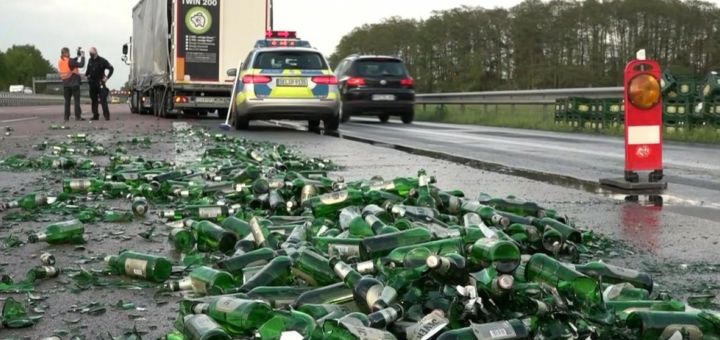 Vozač kamiona izgubio je veliki tovar piva na njemačkom auto-putu, a razbijeno staklo i prosuta pjena doveli su do prekida saobraćaja, saopštila je policija Gajbe piva pale su sa strane...