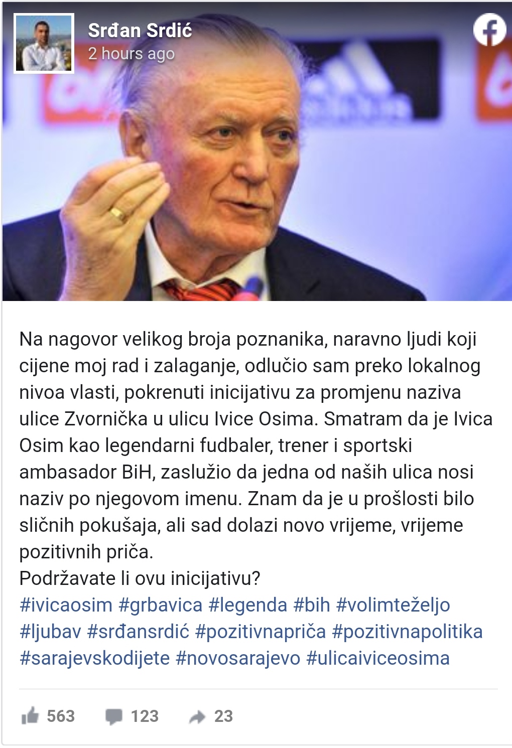 Na nagovor velikog broja poznanika, naravno ljudi koji cijene moj rad i zalaganje, odlučio sam preko lokalnog nivoa vlasti pokrenuti inicijativu za promjenu naziva ulice Zvornička u ulicu Ivice Osima. Smatram da je Ivica Osim kao legendarni fudbaler, trener i sportski ambasador BiH zaslužio da jedna od naših ulica nosi naziv po njemu. Znam da je u prošlosti bilo sličnih pokušaja, ali sada dolazi novo vrijeme, vrijeme pozitivnih priča”, napisao je Srdić koji je na lokalnim izborima održanim prošlog mjeseca u Novom Sarajevu osvojio 1.959 glasova.