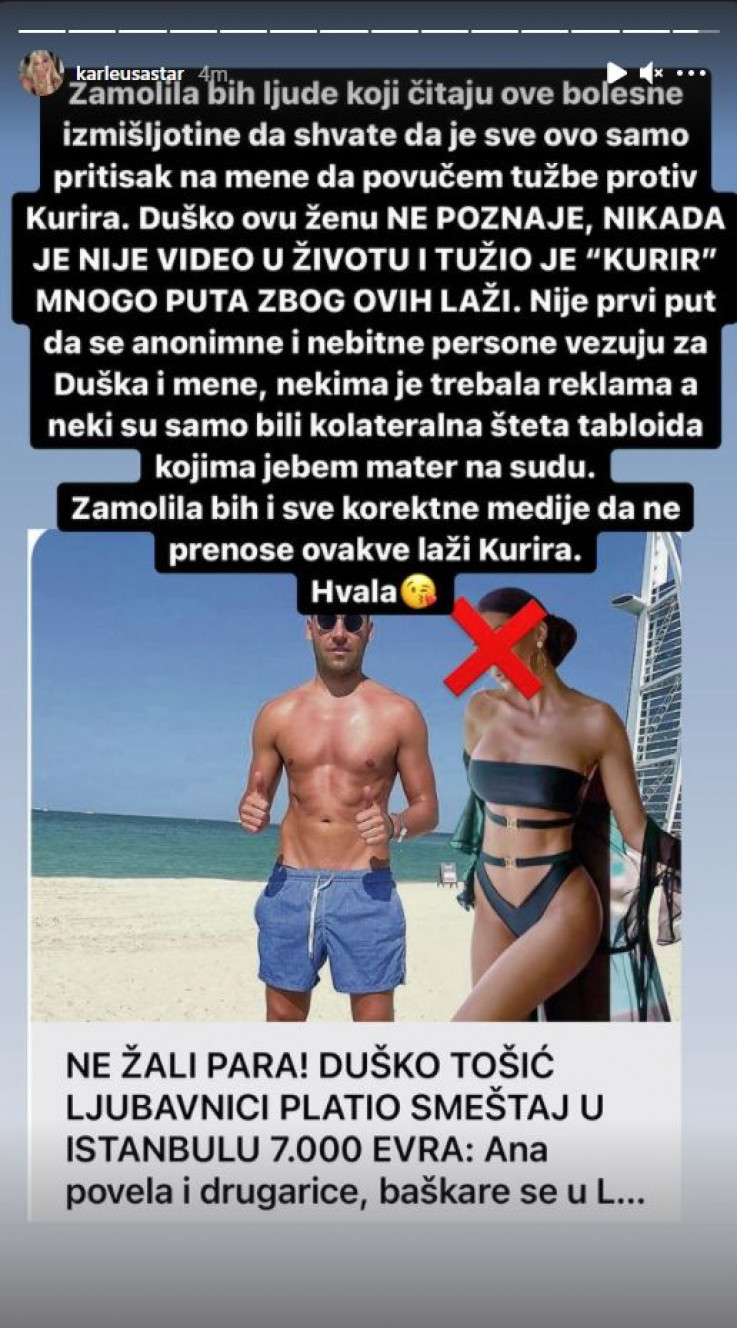 Čak je i supruga Duška Tošića, Jelena Karleuša više puta na svom Instagram profilu javno demantirala ovu priču, te oštro osudila namjere medija da unište njen brak sa fudbalerom.