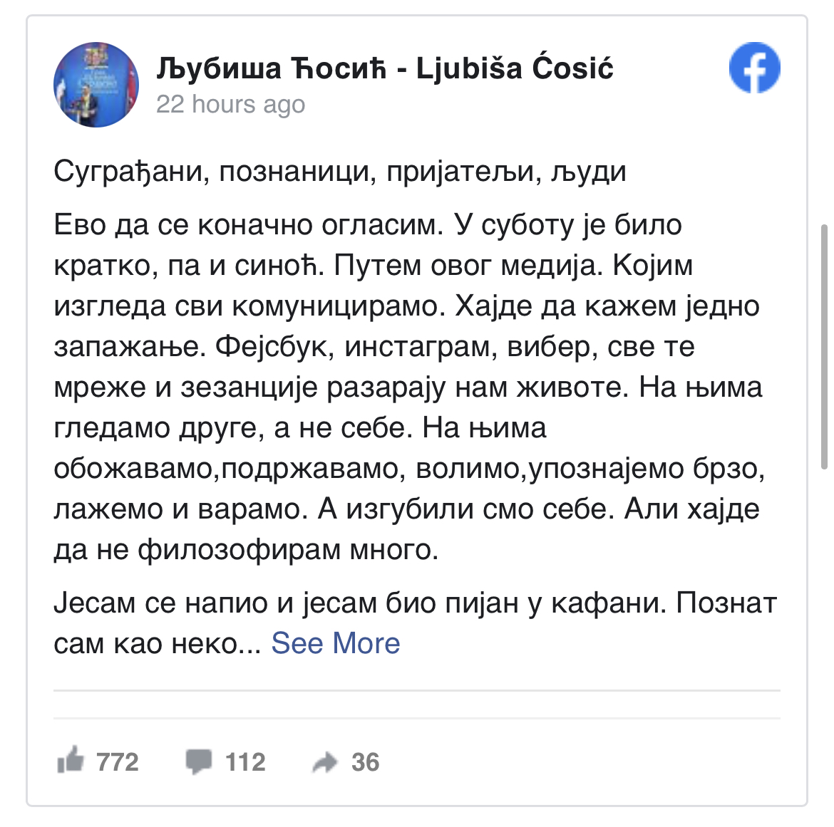 Gradonačelnik Istočnog Sarajeva Ljubiša Ćosić oglasio se ponovo na svom Facebook profilu nakon optužbi da je bio pijan u kafani, da se sukobio s nekoliko gostiju i čak udario svoju partnericu.