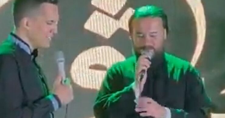 Trebinjski đakon Branislav Rajković i pjevač Armin Muzaferija izvode ilahiju na manifestaciji u Trebinju, čiji je pokrovitelj Federalno ministarstvo raseljenih osoba i izbjeglica.