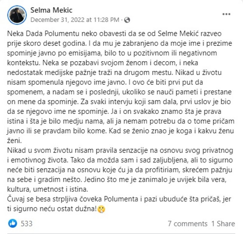 – Neka Dadu Polumentu neko obavijesti da se od Selme Mekić razveo prije skoro deset godina. I da mu je zabranjeno da moje ime i prezime spominje javno po emisijama, bilo to u pozitivnom ili negativnom kontekstu. Neka se pozabavi svojom ženom i djecom, i neka nedostatak medijske pažnje traži na drugom mjestu. Nikad u životu nisam spomenula njegovo ime javno. I ovo će biti prvi put da spomenem, a nadam se i posljednji, ukoliko se nauči pameti i prestane on mene da spominje. Za svaki intervju koji sam dala, prvi uslov je bio da se njegovo ime ne spominje. Ja i on svakako znamo šta je istina i šta je bilo među nama, ali ja nemam potrebu da o tome pričam javno ili se pravdam bilo kome. Kad se ženio znao je koga i kakvu ženu ženi – rekla je.