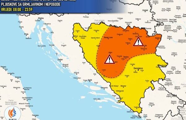 Najveća vjerovatnoća za lokalnu pojavu nevremena u dijelovima centralne, sjeverne i sjeveroistočne Bosne te kasno noćas i u dijelu Hercegovine.