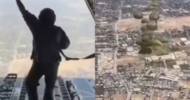 Na društvenim mrežama ubrzo se pojavio i snimak akcije koja pokazuje pošiljke koje su bačene iz aviona iznad ratom razorene Gaze.