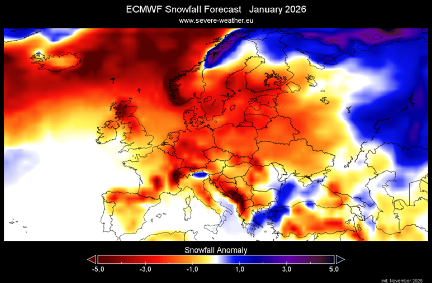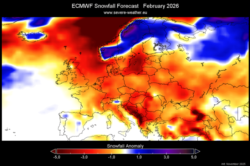Decembar donosi pretežno negativne anomalije, osim na krajnjem sjeveru. Manjak snijega na višim nadmorskim visinama više ukazuje na nedostatak padavina nego na visoke temperature. U januaru se ne očekuje značajno poboljšanje – većina Evrope imaće manje snijega od prosjeka, iako bi jugoistok i krajnji sjever mogli imati nešto više padavina. Februar pokazuje blaži manjak snijega u odnosu na januar, ali i dalje se očekuju ispodprosječne količine.