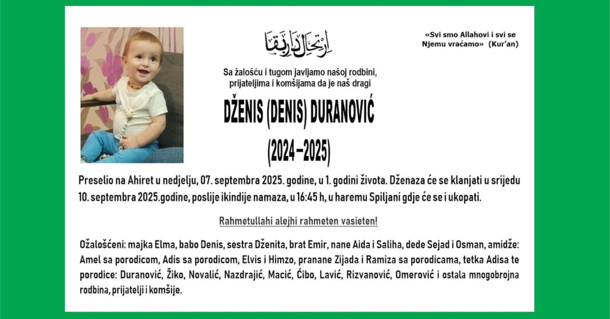 Danas će u Konjicu biti klanjana dženaza Dženisu Duranoviću, dječaku koji je preselio na ahiret u prvoj godini života. Njegova smrt potresla je cijelu lokalnu zajednicu, ali i širu javnost, jer je još jedan tragičan podsjetnik na ozbiljne propuste u zdravstvenom sistemu. Dženis se iznenada razbolio, a njegovi roditelji, Elma i Denise, odmah su potražili … Nastavi čitati Tuga pregolema: Na putu do bolnice preminuo jednogodišnji Dženis Duranović […]