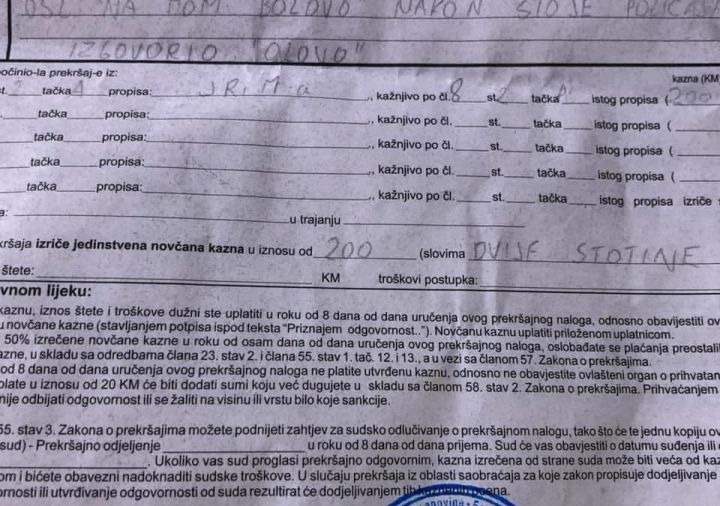 Policijski službenik Ministarstva unutrašnjih poslova (MUP) Kantona Sarajevo napisao je prekršajni nalog jednom građaninu jer mu je na izgovornu riječ “Olovo” odgovorio riječima: “Na mom...