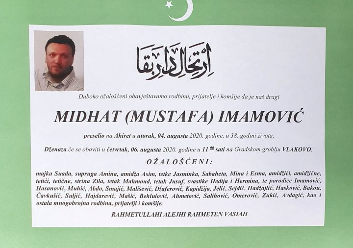 Nakon što je prvog dana Kurban-bajrama preselio Mustafa Imamović od posljedice koronavirusa, četiri dana iza, preselio je i njegov sin Midhat Imamović, uposlenik Općine Novi Grad...