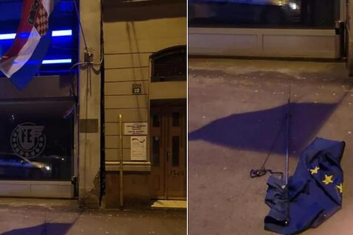 U noći sa subote na nedjelju potrgana je zastava Evropske unije, te savijeni nosači zastava na zgradi u kojoj se nalaze prostorije Konzularnog odjela Ambasade Republike Hrvatske u centru...