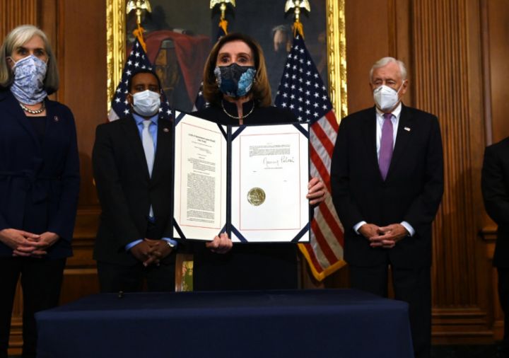 Nensi Pelosi (Nancy), predsjedavajuća Predstavničkog doma Kongresa, dala je kratku izjavu nakon zasjedanja Predstavničkog doma Kongresa na kojem je izglasan opoziv predsjedniku Donaldu Trampu...