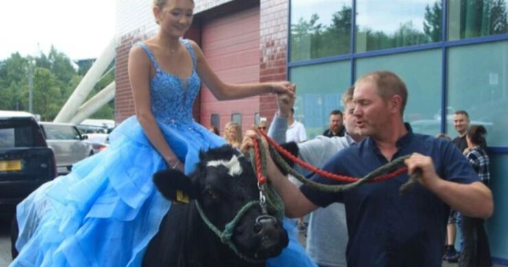 Maturantica Kloe došla je na kravi Oazis u pratnji svog oca Ričarda (43) i brata Tomasa (19). Djevojka je krenula stopama svog starijeg brata, koji je na školsku maturu 2022. godine otišao u ogromnom žutom traktoru.