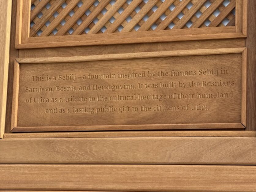 “Ovo je Sebilj – fontana inspirisana poznatim Sebiljem u Sarajevu, u Bosni i Hercegovini. Izgradili su ga Bosanci iz Utice kao počast kulturnoj baštini svoje domovine i kao trajni javni dar građanima Utice.”